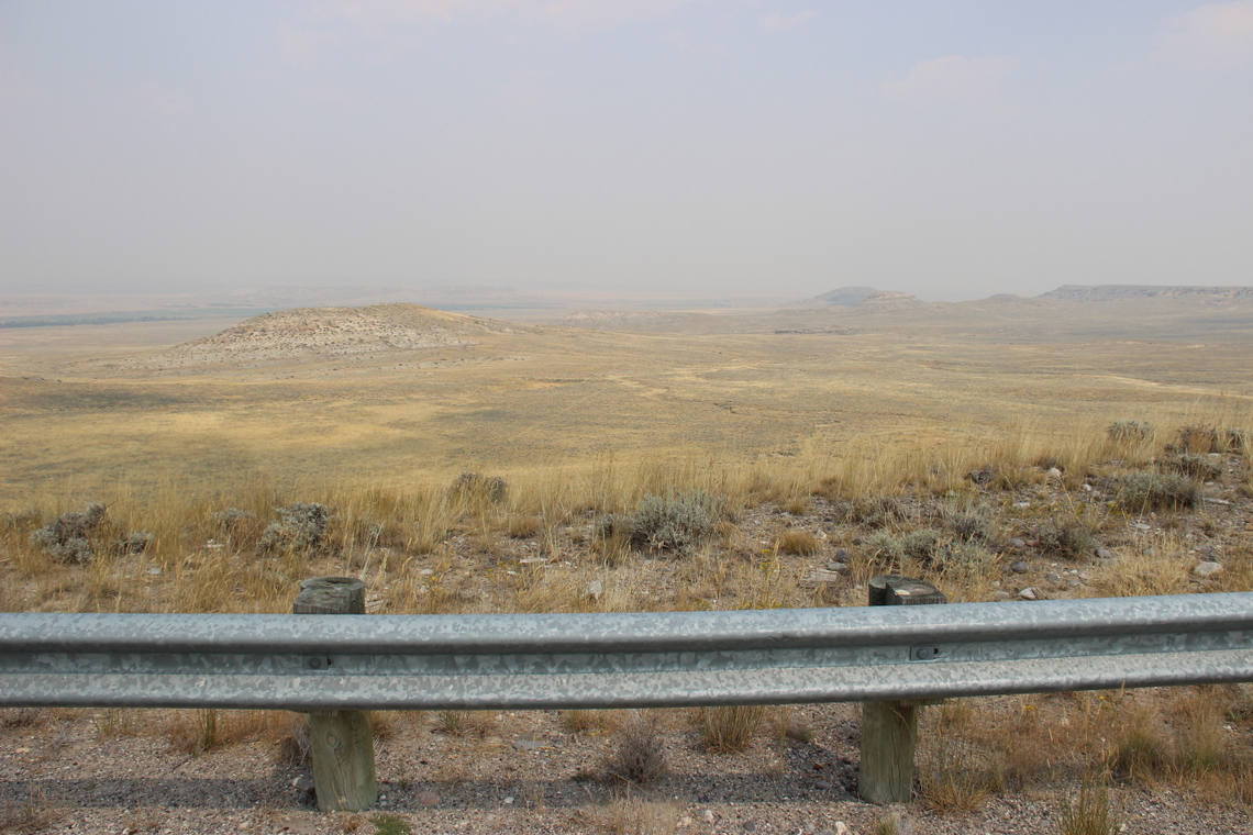 This is what, in a way, happened to me, cycling through Wyoming. Despite the bad visibility due to wildfires burning in Idaho, riding a bicycle through Yellowstone and Grand Teton was very much a memorable experience. Very shortly after leaving the park boundary behind and making it across Togwotee Pass at 9,584 feet, the greens gave way to yellows and light browns. The further south Peter, Jim and I went, the more barren and, seemingly, void of life our surroundings got. The lingering wildfire smoke only added further to that. It got especially depressing crossing the Wind River Indian Reservation with emptiness all the way to the horizon in all directions, not a single settlement in sight.