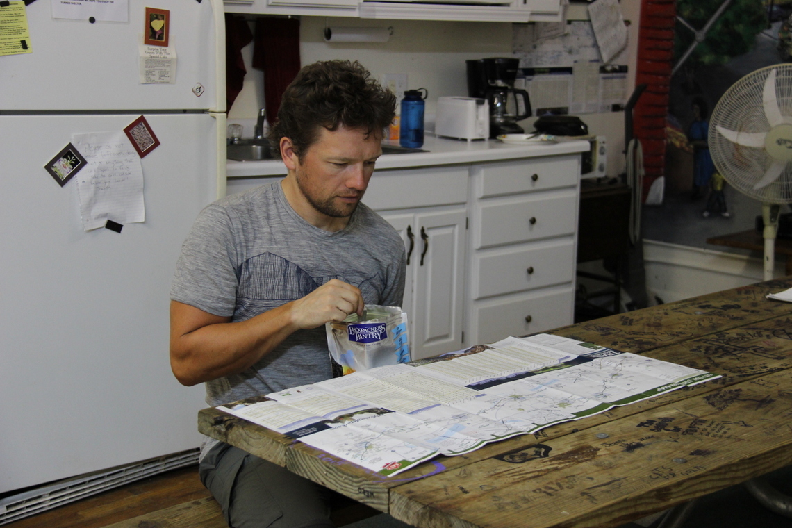 - Studying the trail ahead at the Katy Trail Shelter in Tebbetts, MO